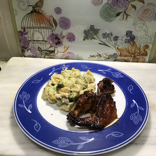 Cayenne and honey Chicken wings and Cheese, Broccoli, Sweetcorn and Mushroom Pasta