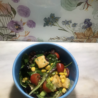 You have crunchy sweetcorn and lettuce, soft, salty olives and sweet tomatoes. Absolutely amazing. In addition, it complements all of the elements of the salad to create multidimensional flavours. You can adapt the vegetables but the star of the show is the halloumi cheese m