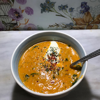Adding the velvety green spinach adds extra flavour and texture. The double cream garnish and arbol chilli add even more flavour and texture. The other reason why I add chilli flakes is to give the soup a bit of a kick. It was enjoyable to make because the roasted pepper soup was so sweet and tasty and had depth to it.